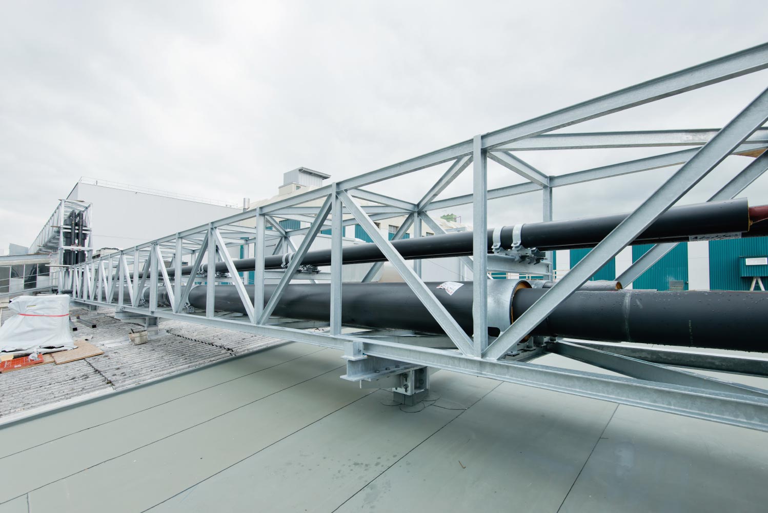 Stahlkonstruktion in Fachwerksausführung. Einzelne Bauteile: 8 Meter lang, Breite: 2,5 Meter x Höhe: 2,5 Meter. Gesamtlänge ca. 100 Meter. Fernleitung Stahlkonstruktion für Versorgungsleitungen (Förderband) zwischen Gebäude G17 und G24.