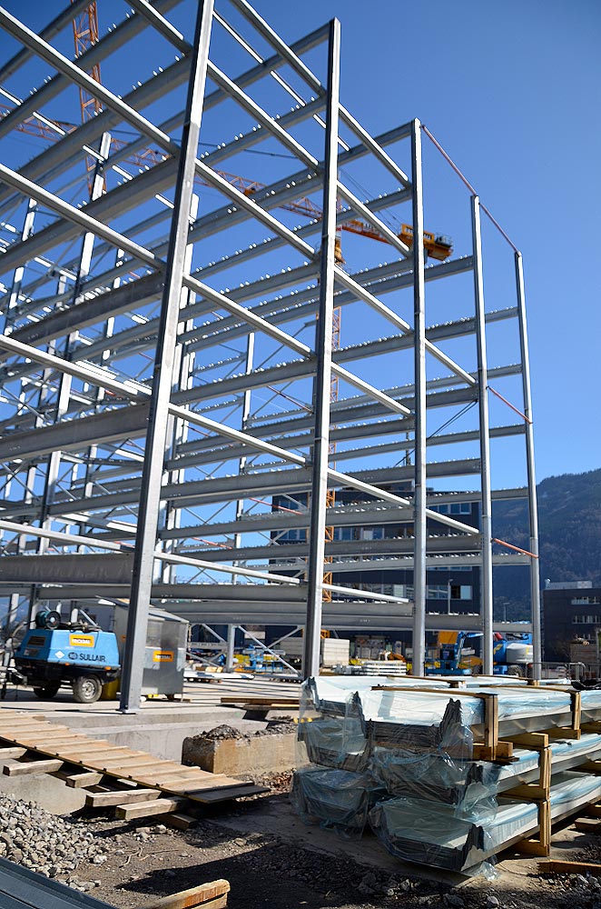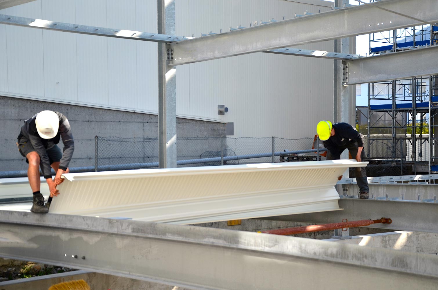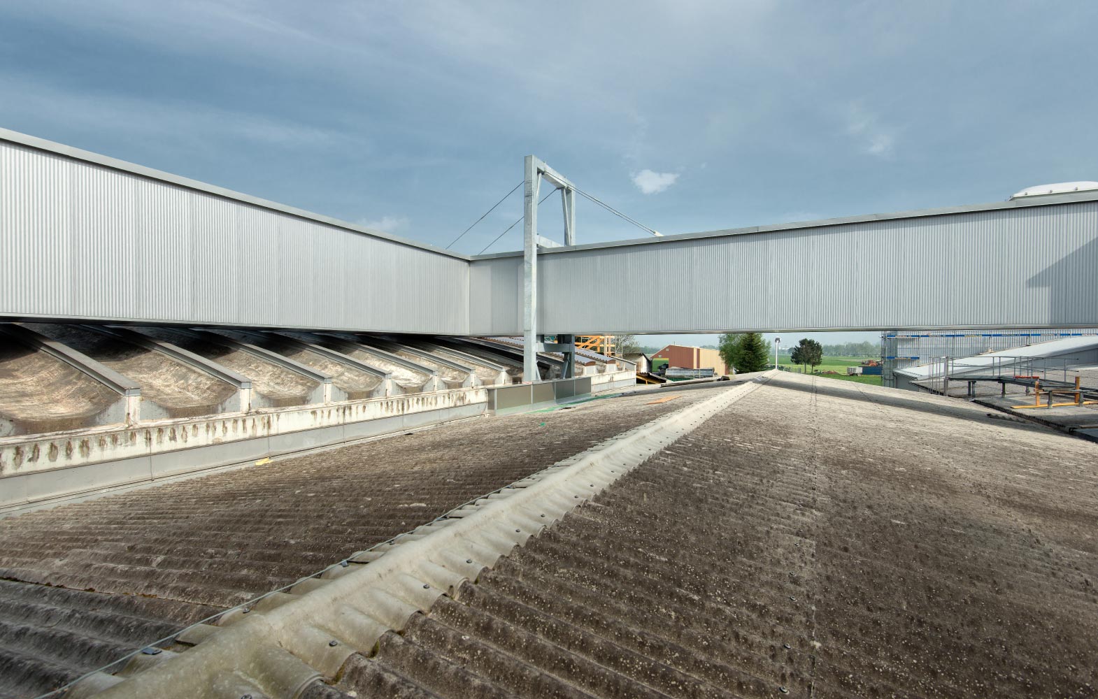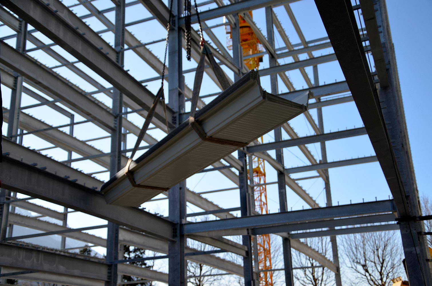 Inkl. Dachpfetten, Unterkonstruktion, Windverbänden und Fluchttreppen.