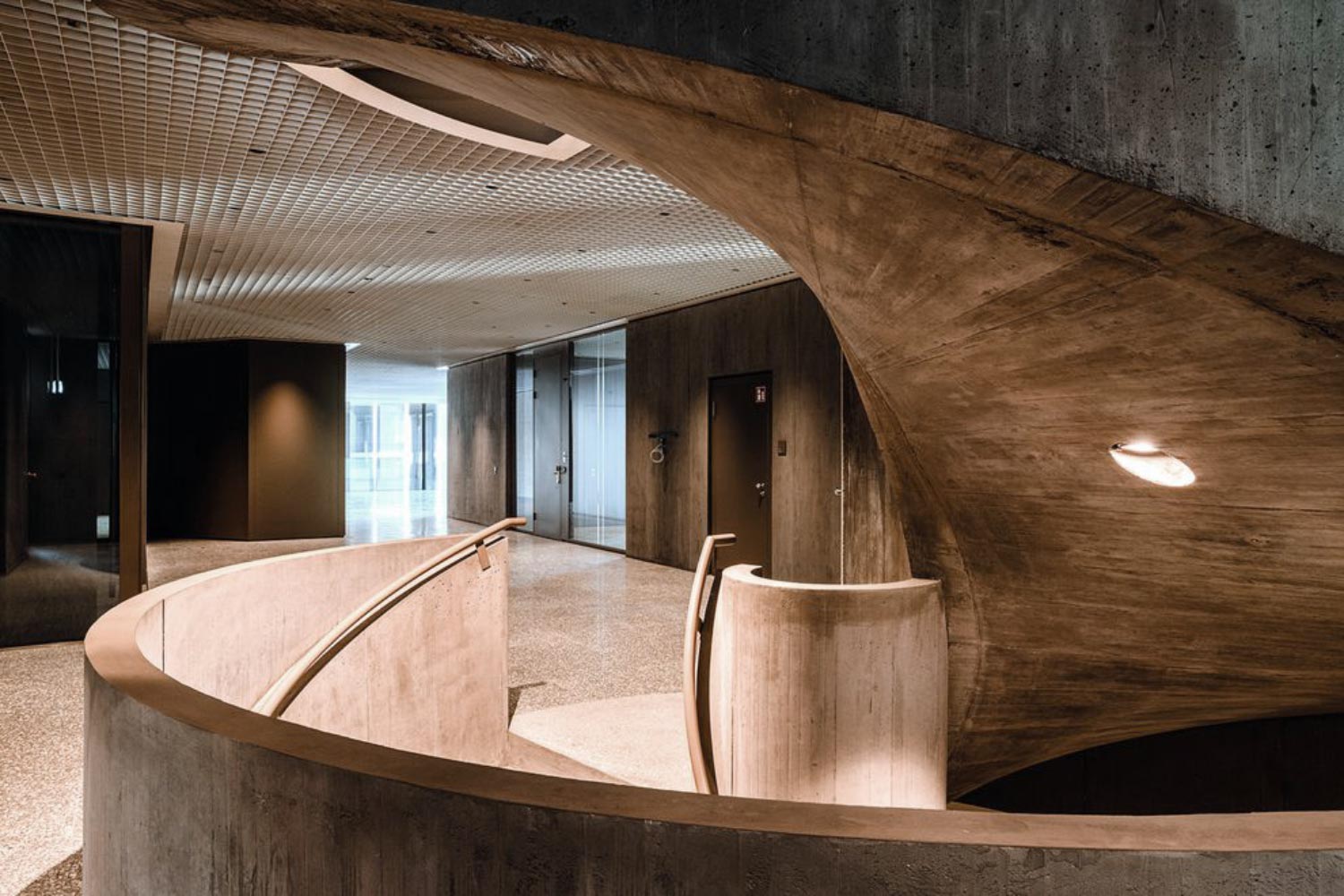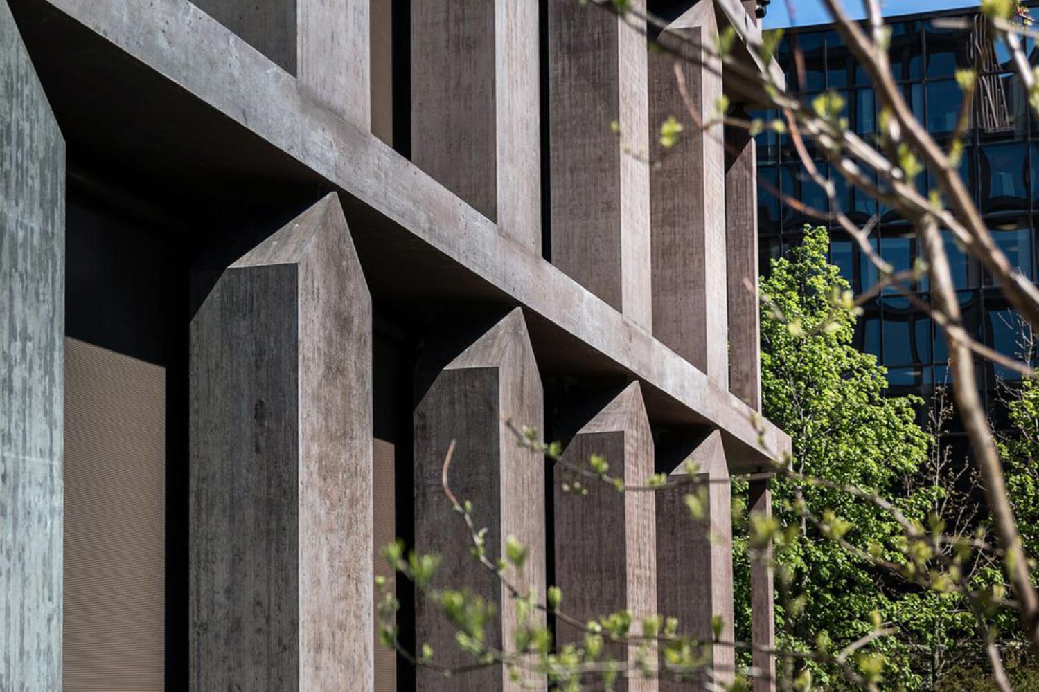 Rotbraun eingefärbter Beton und Glas – die hinter einem Arrangement von unterschiedlich ausgeformten und unterschiedlich breiten Stützen platzierte Glasfassade des 42 m hohen Bürogebäudes dominiert den imposanten Bau. Rund um ein lichtspendendes Atrium gliedern sich auf zehn Geschossen Flächen zum Arbeiten und Ausbilden.