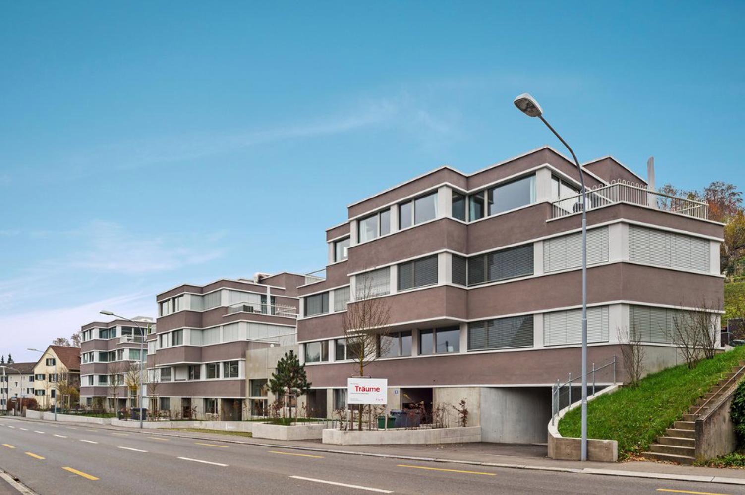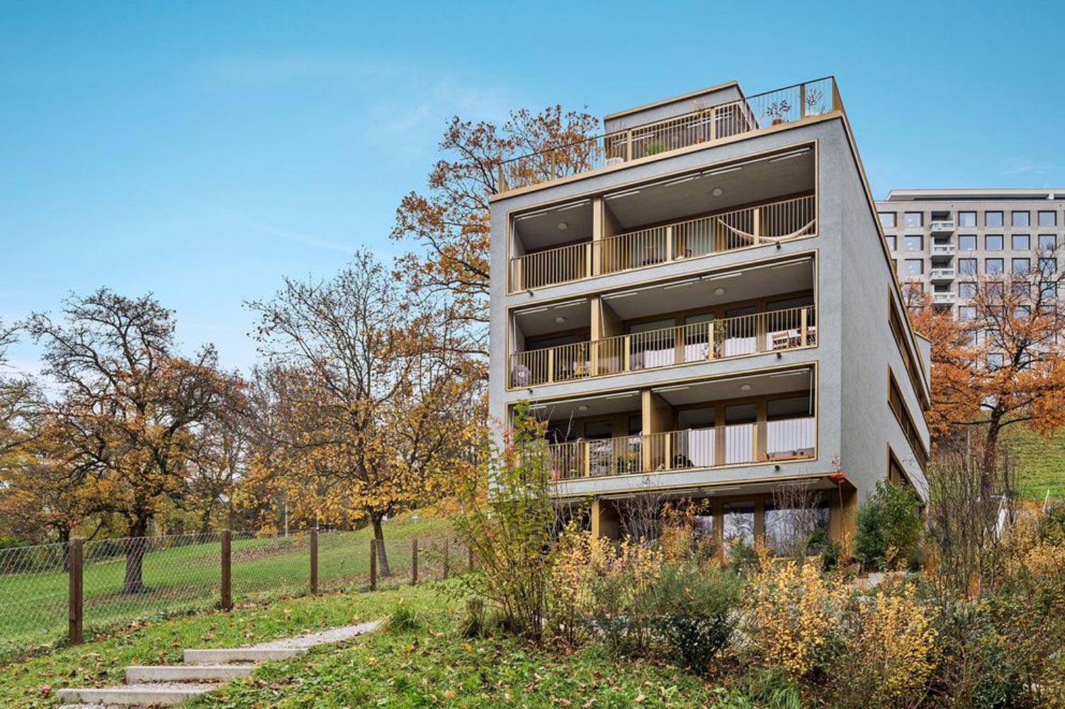 Stadtnah wohnen mit Blick auf Schrebergärten. Nach dem Rückbau von drei asbestbelasteten Altliegenschaften realisierte man in einer Bauzeit von nur 18 Monaten dieses aus drei Wohnhäusern bestehende Projekt. Die acht Eigentums- und 20 Mietwohnungen inklusive Tiefgarage sind nach Minergie-Standard zertifiziert.