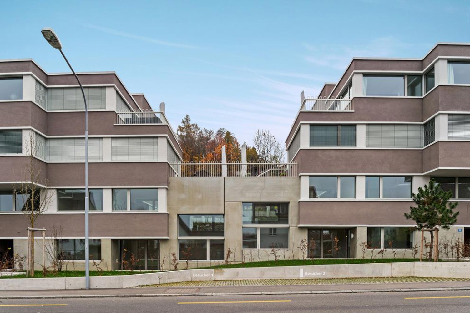 Die nach Minergie-P-Eco zertifizierte Wohnanlage besteht aus je drei Vollgeschossen und einem Attikageschoss. Das durchgehende Untergeschoss beinhaltet neben Haustechnik- und Kellerräumen auch 63 Stellplätze für Personenwagen.
