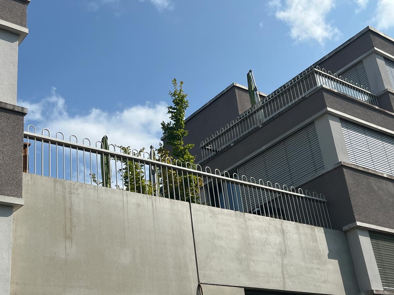 Die Fassade des Parkhauses besteht aus vertikal montierten Aluminium - Lamellen, die auf eine Rohrunterkonstruktion montiert wurden.