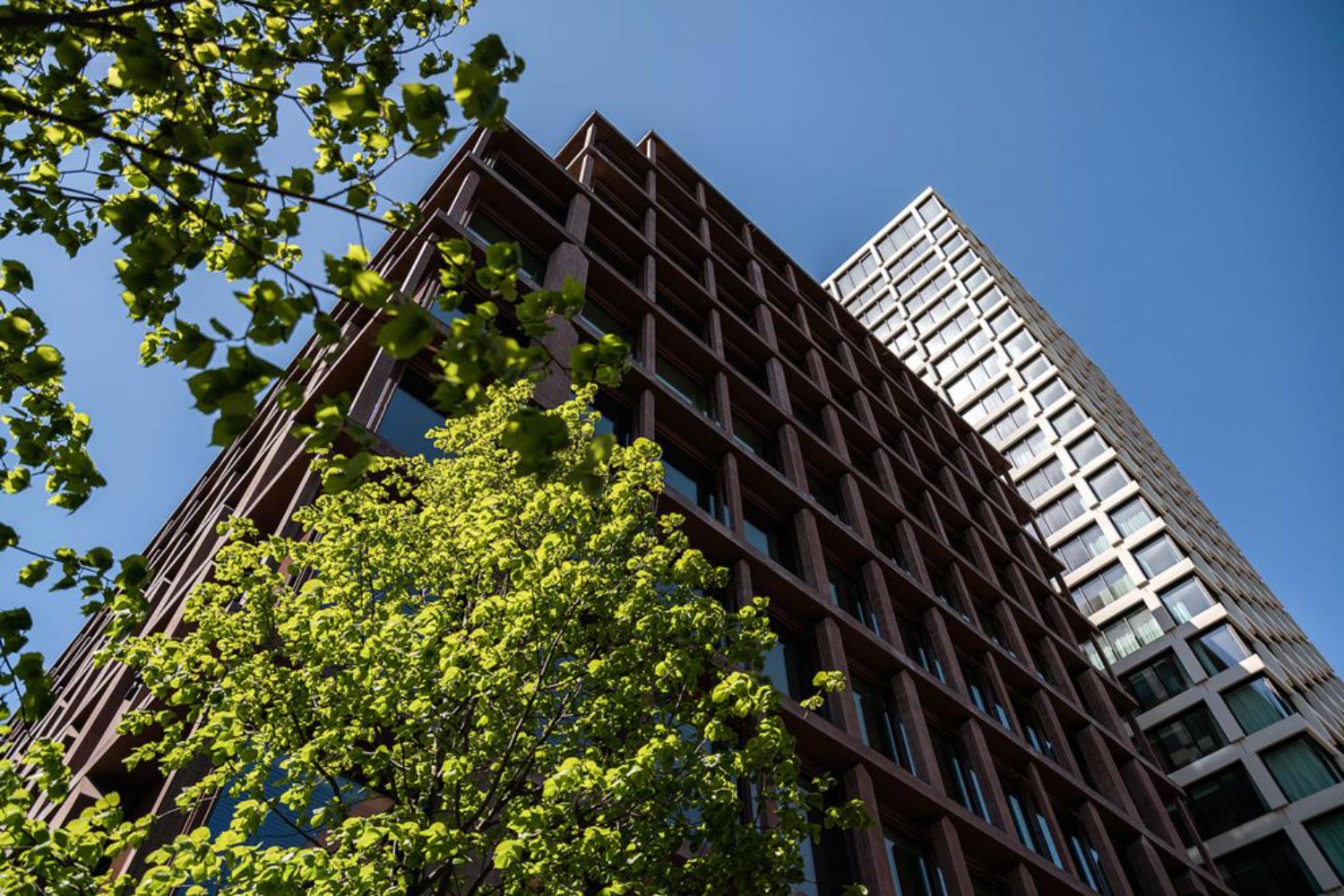 Rotbraun eingefärbter Beton und Glas – die hinter einem Arrangement von unterschiedlich ausgeformten und unterschiedlich breiten Stützen platzierte Glasfassade des 42 m hohen Bürogebäudes dominiert den imposanten Bau. Rund um ein lichtspendendes Atrium gliedern sich auf zehn Geschossen Flächen zum Arbeiten und Ausbilden.