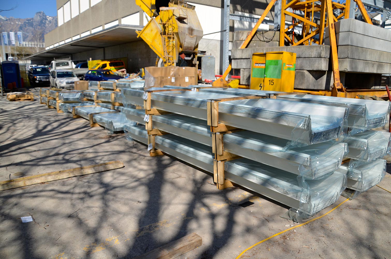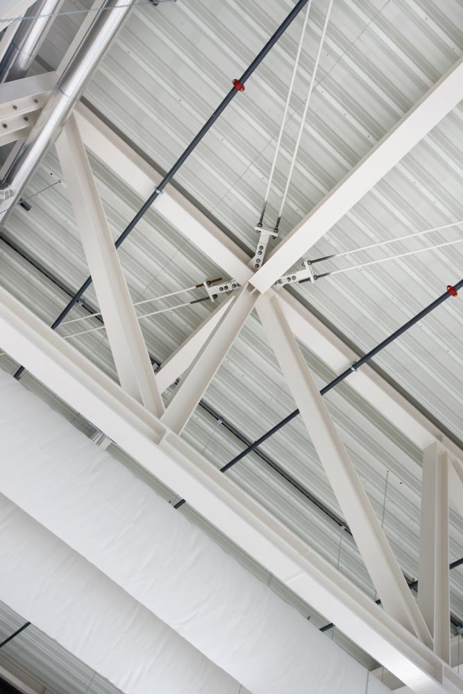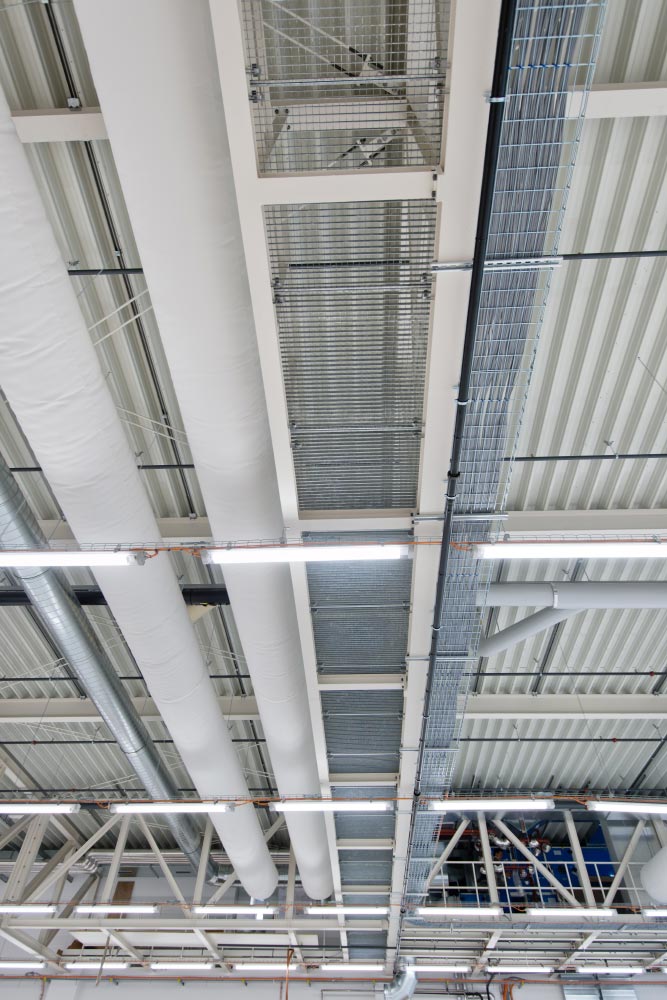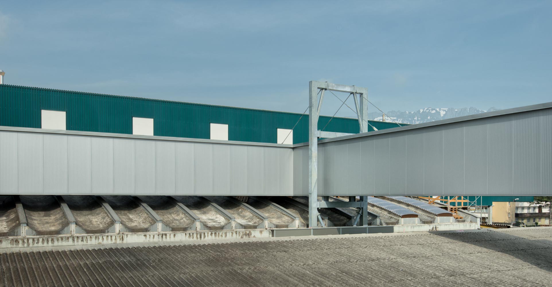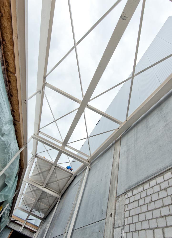 Inkl. Dachpfetten, Unterkonstruktion, Windverbänden und Fluchttreppen.