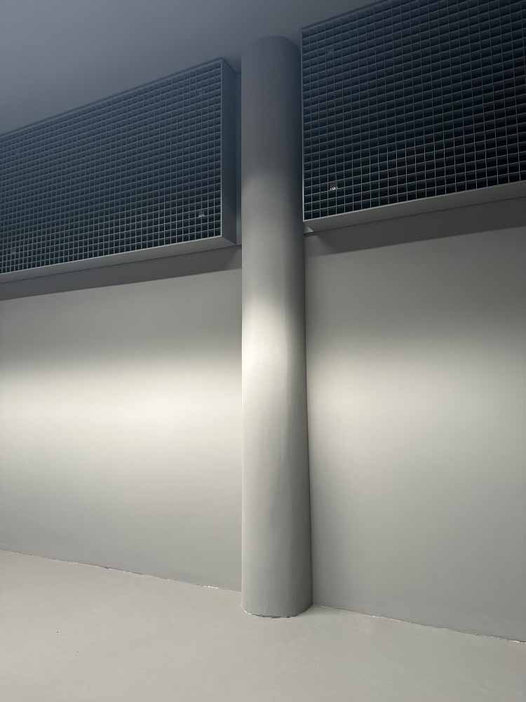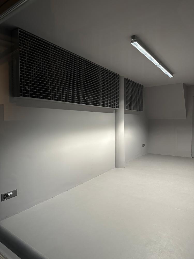 Herstellen einer Wandverkleidung aus Gitterrosten mit umlaufendem Flachstahl inkl. Vlies und Dämmung für Akustikschutz. Konstruktion lackiert mit NCS Farbton und an Betonwand befestigt.